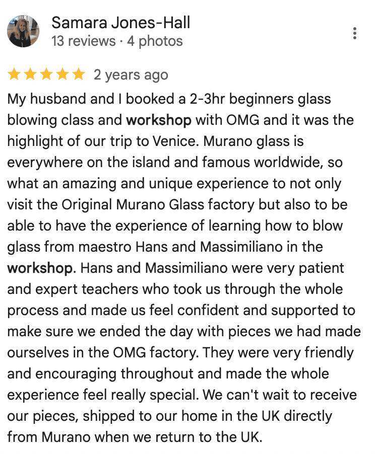 We can also organise a water TAXI service to take you directly to our glassworks from your location in Venice.